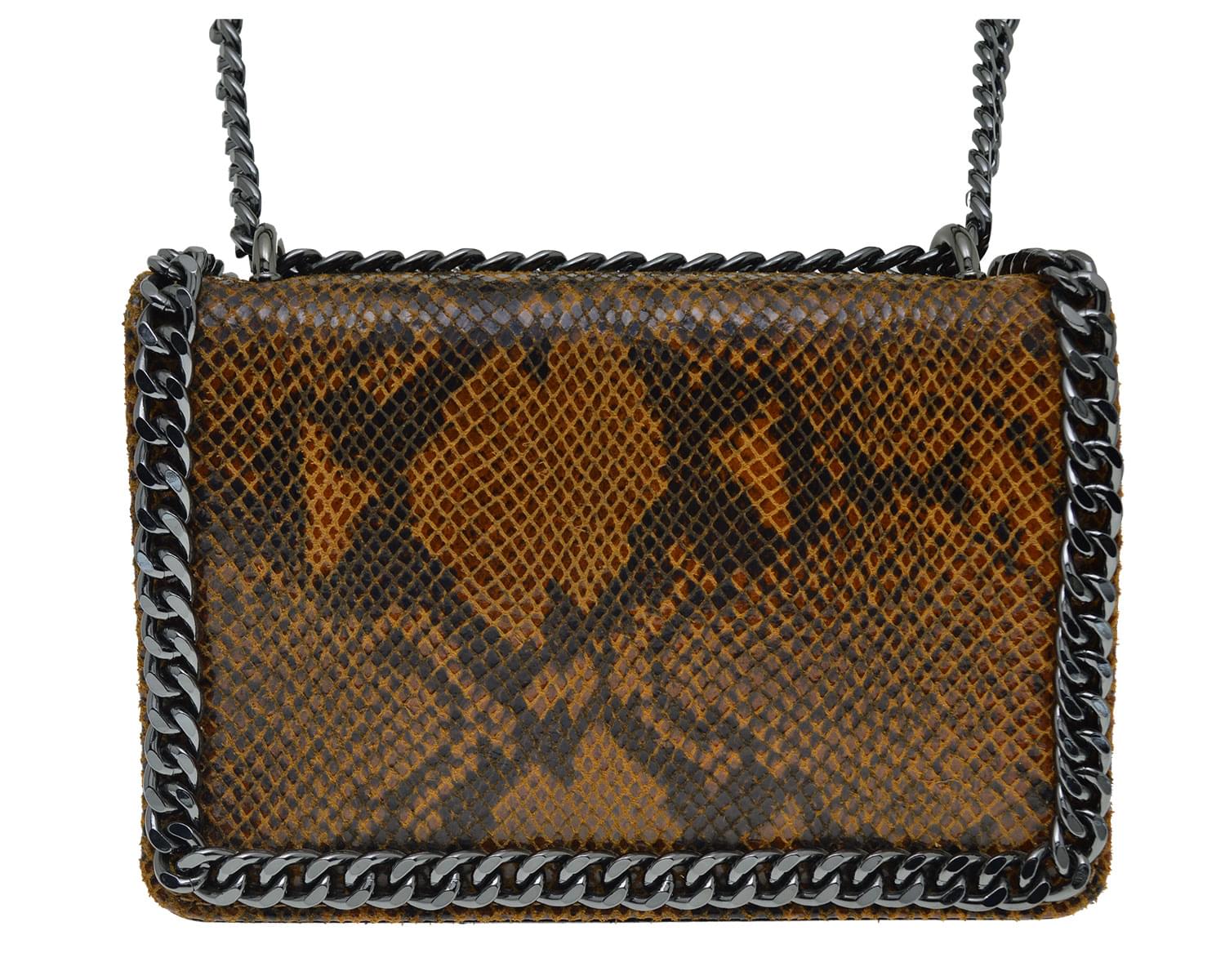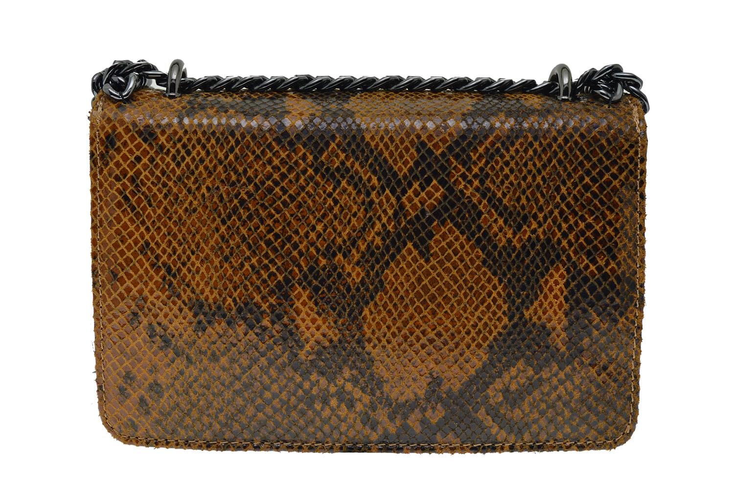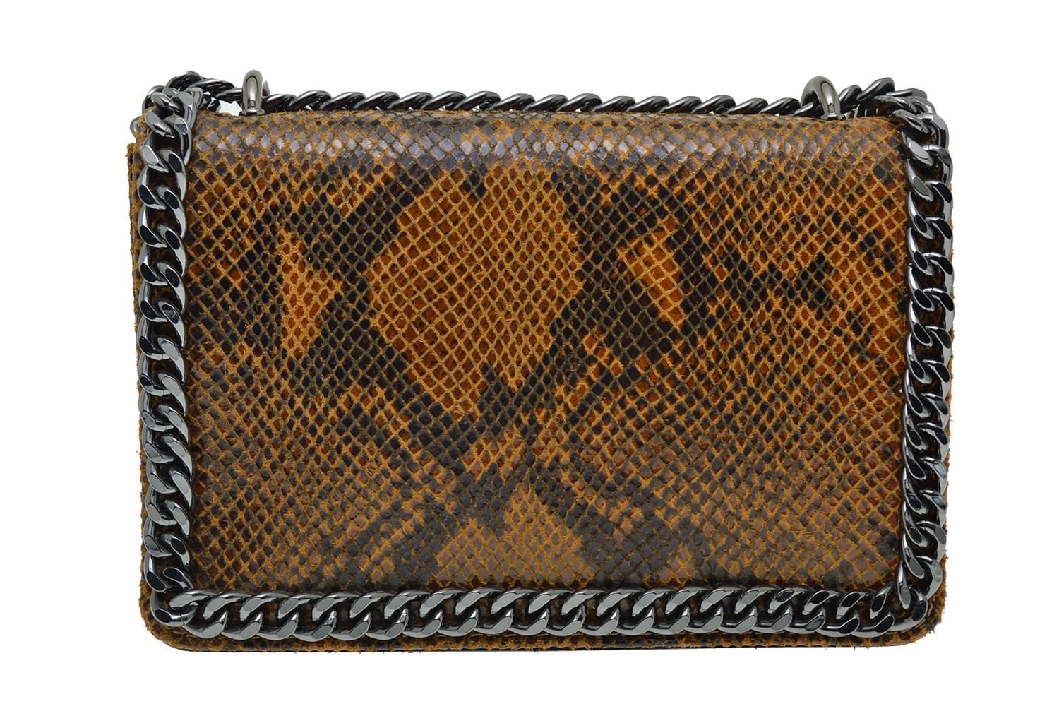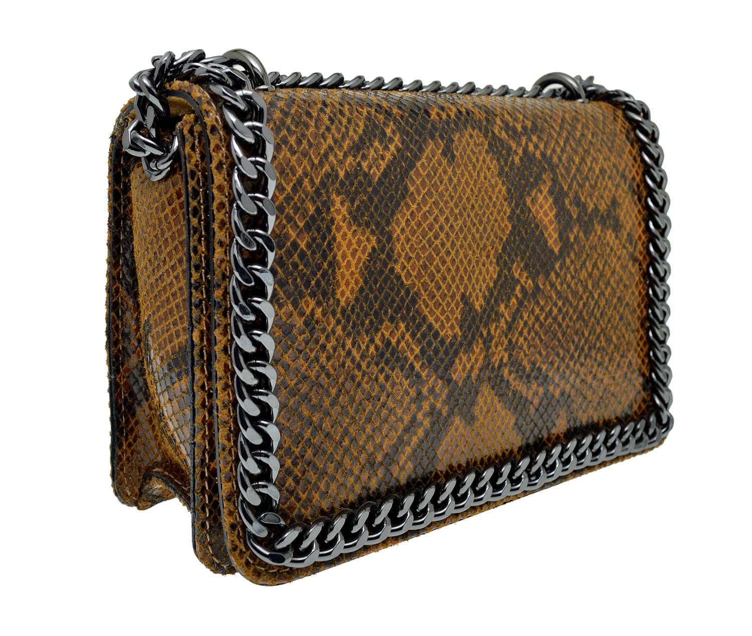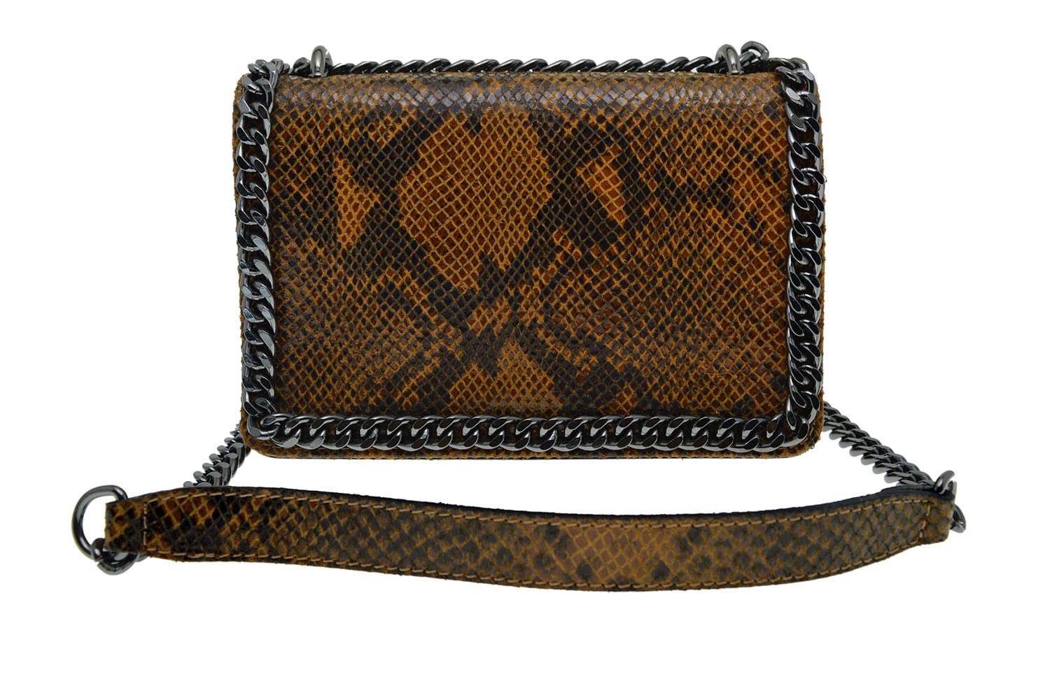 Γυναικεία τσάντα δερμάτινη ταμπά Ιταλικής κατασκευής χιαστί με τύπωμα φιδιού και διακοσμητική αλυσίδα στη μπροστινή πλευρά