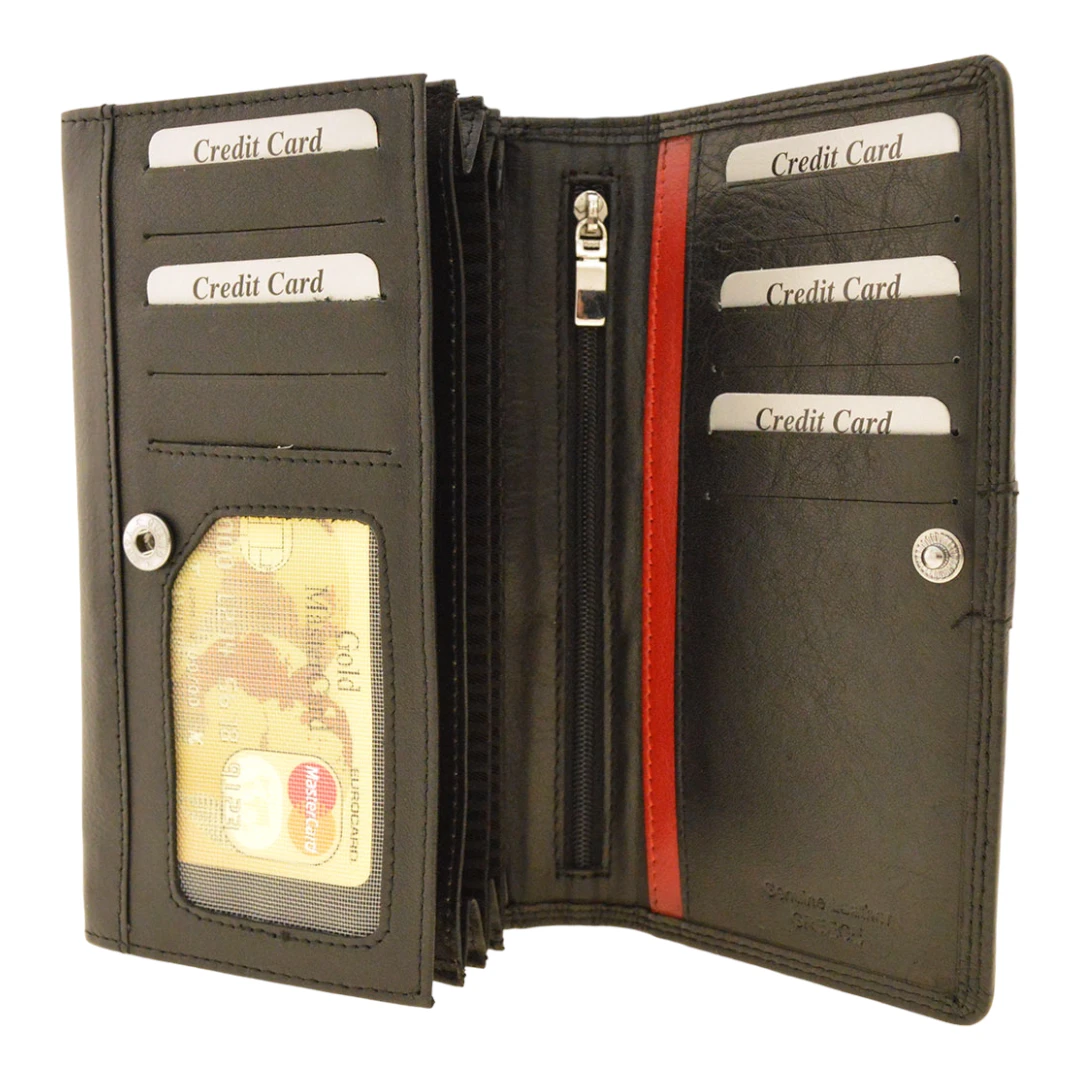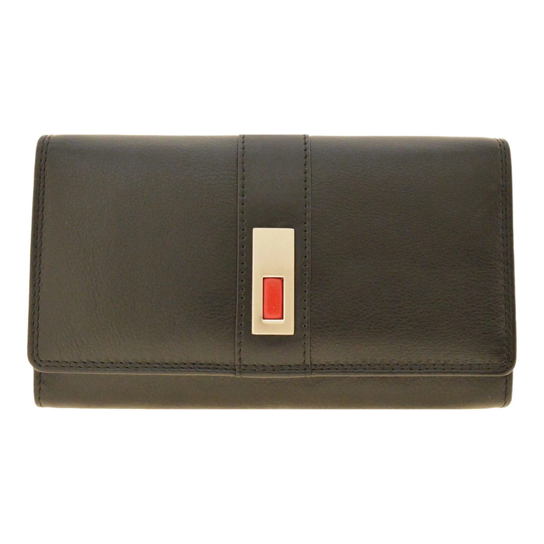 Γυναικείο δερμάτινο Πορτοφόλι Forest F008 σε μαύρο χρώμα με ασημί και κόκκινη λεπτομέρεια στην μπροστινή πλευρά του.