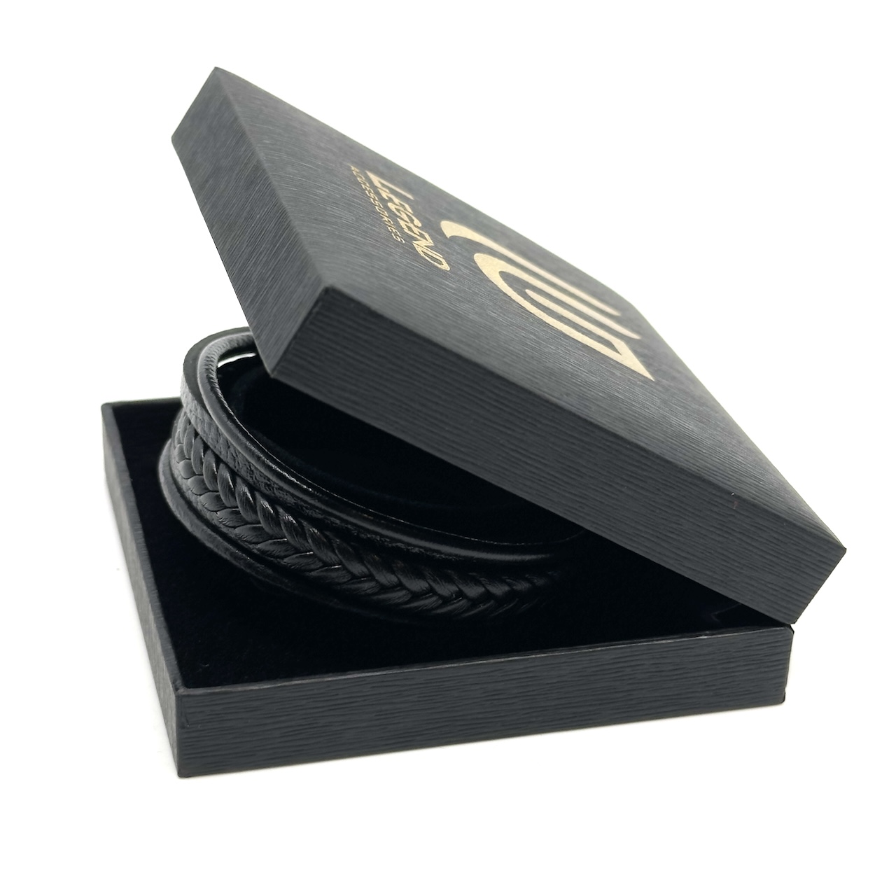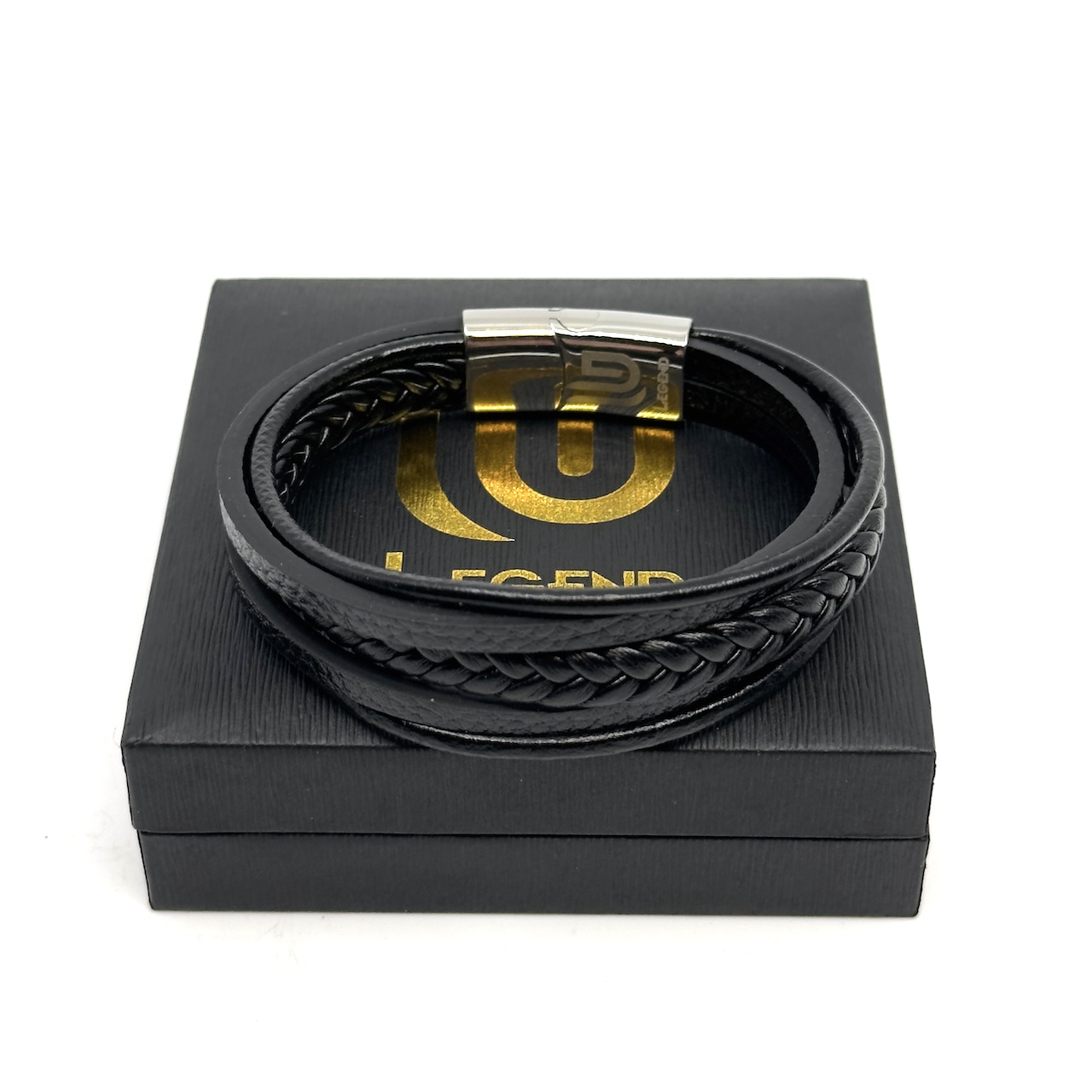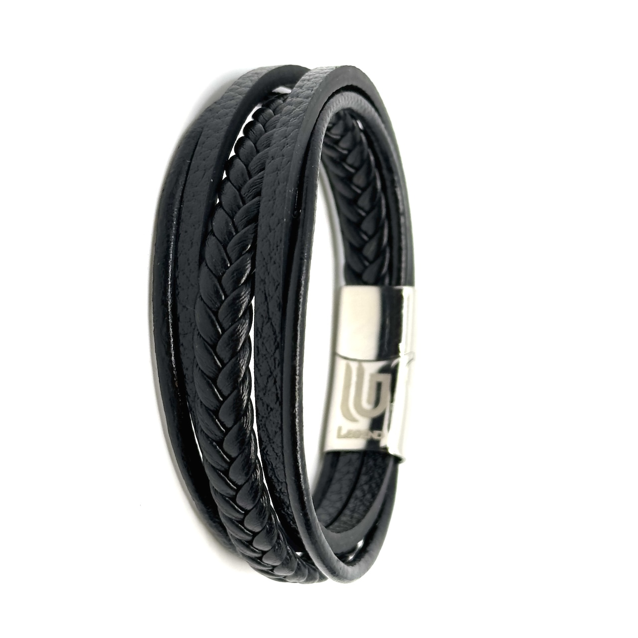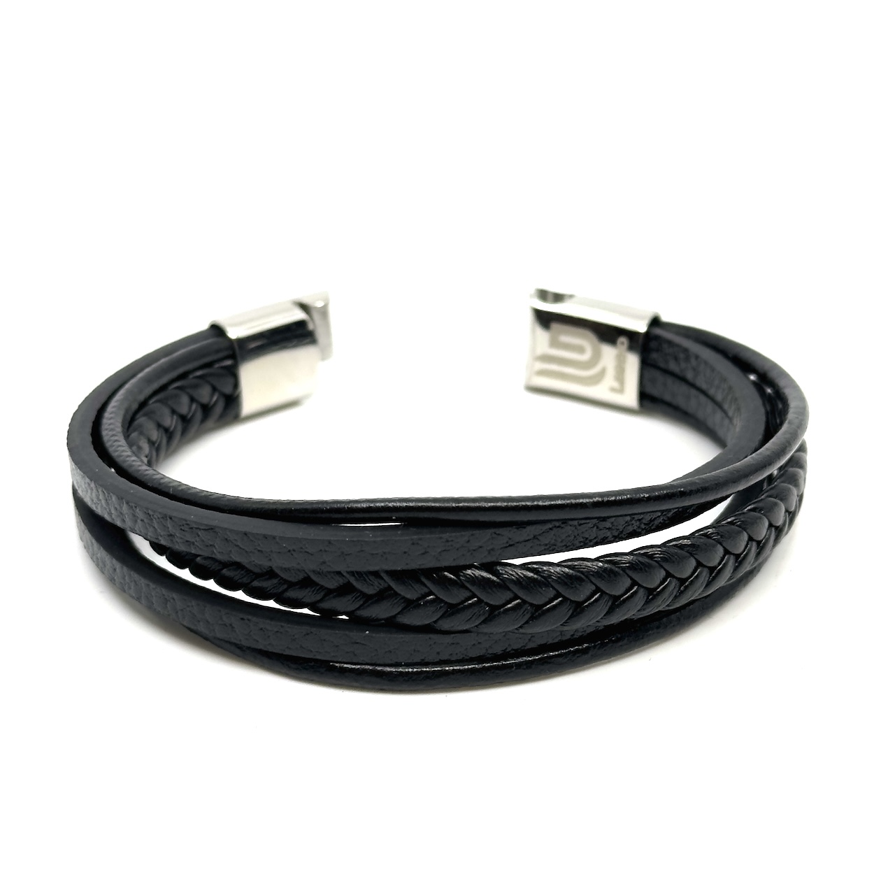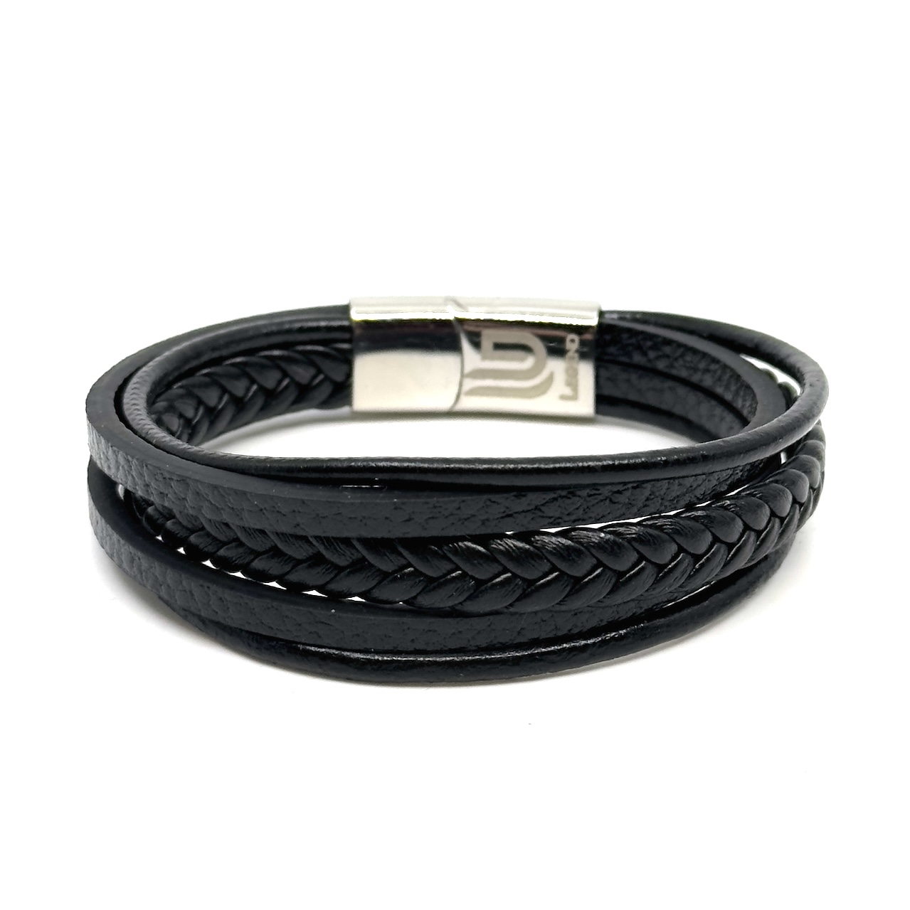 Βραχιόλι δερμάτινο Μαύρο πενταπλό με Ασημί μαγνητική πόρπη από ανοξείδωτο ατσάλι για ασφαλές και εύκολο κούμπωμα.