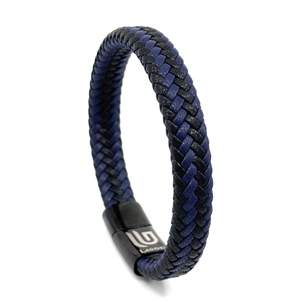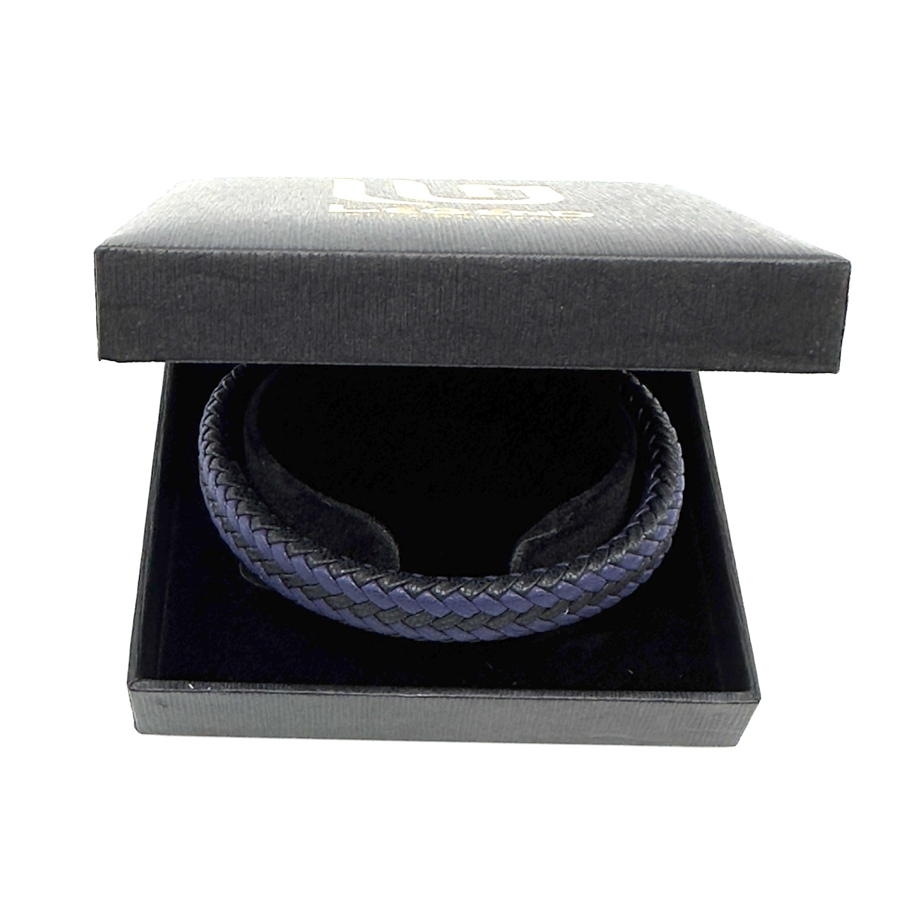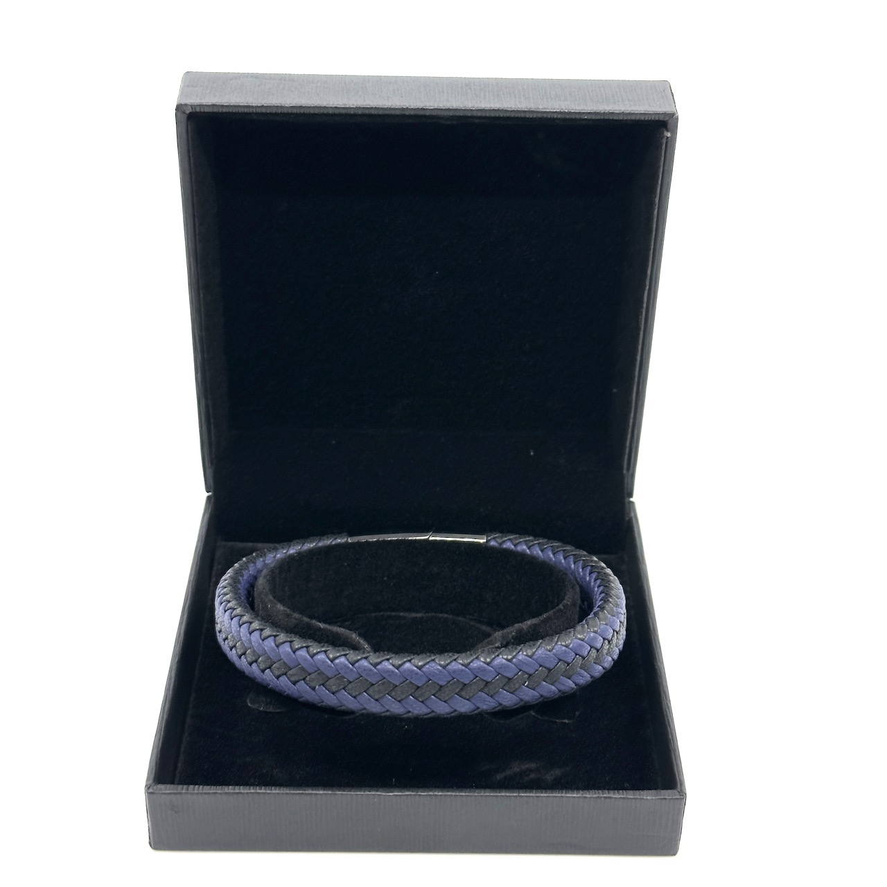 Βραχιόλι δερμάτινο πλεγμένο Μαύρο με Μπλε και Μαύρη μαγνητική πόρπη από ανοξείδωτο ατσάλι για ασφαλές και εύκολο κούμπωμα.